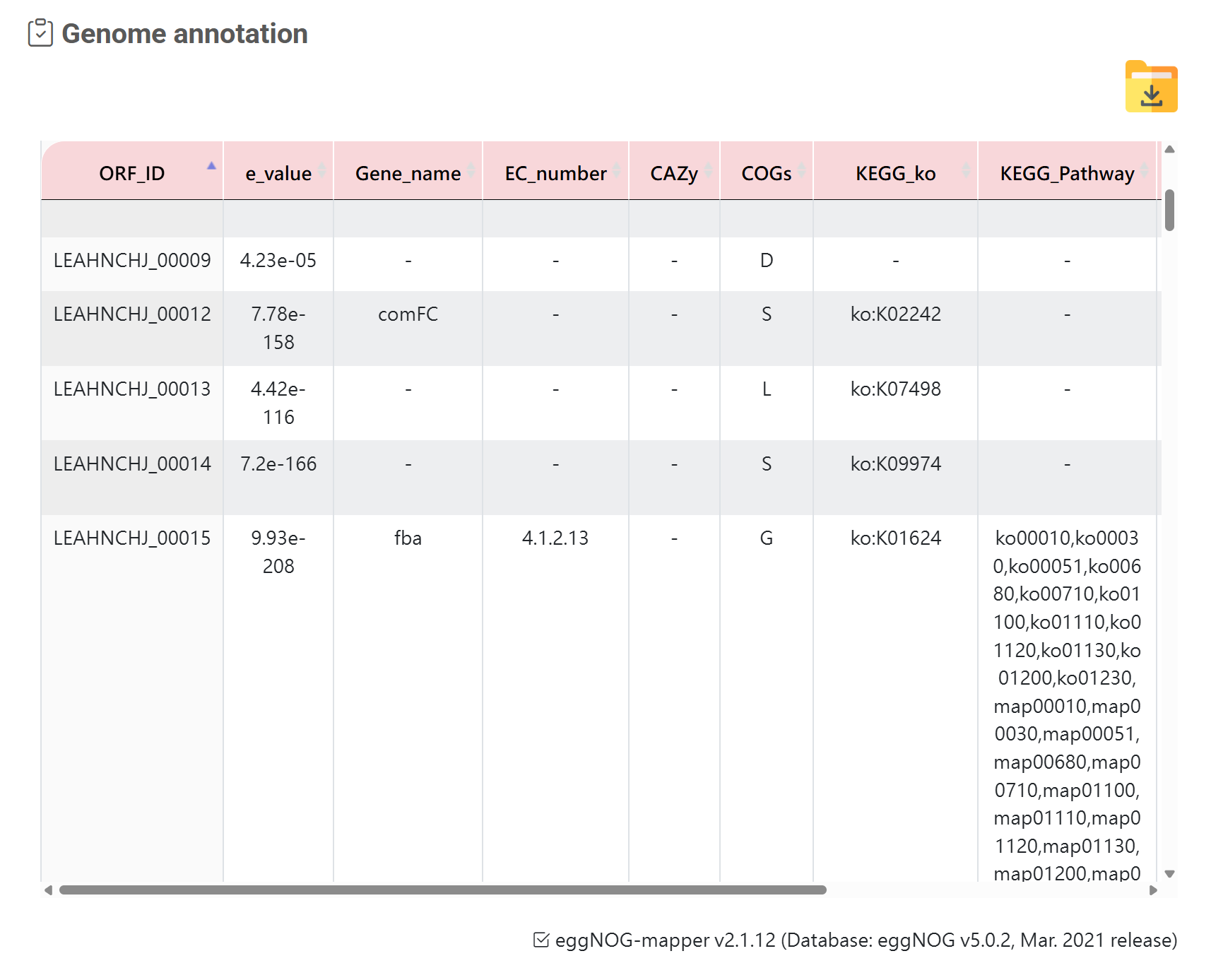| Genome Annotation | eggNOG-mapper v2.1.12 | eggNOG v5.0.2 (Mar. 2021 release) |