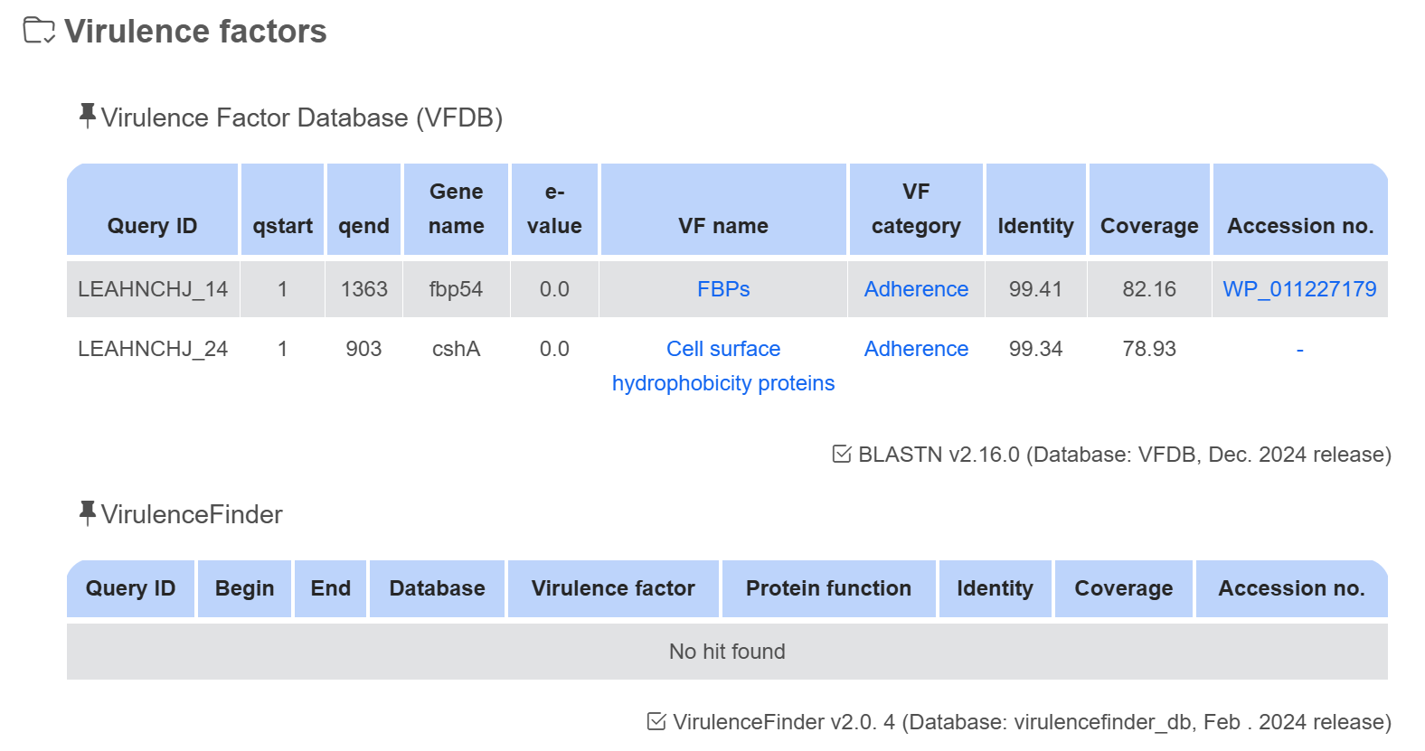 | VirulenceFinder v2.0.4 | virulencefinder_db (Feb. 2024 release) | |