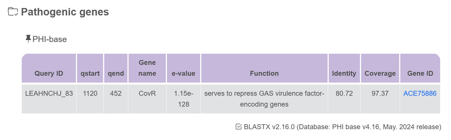 | Pathogenic genes (PGs) | BLASTX v2.16.0 | PHI-base v4.16 (May. 2024 release) |
