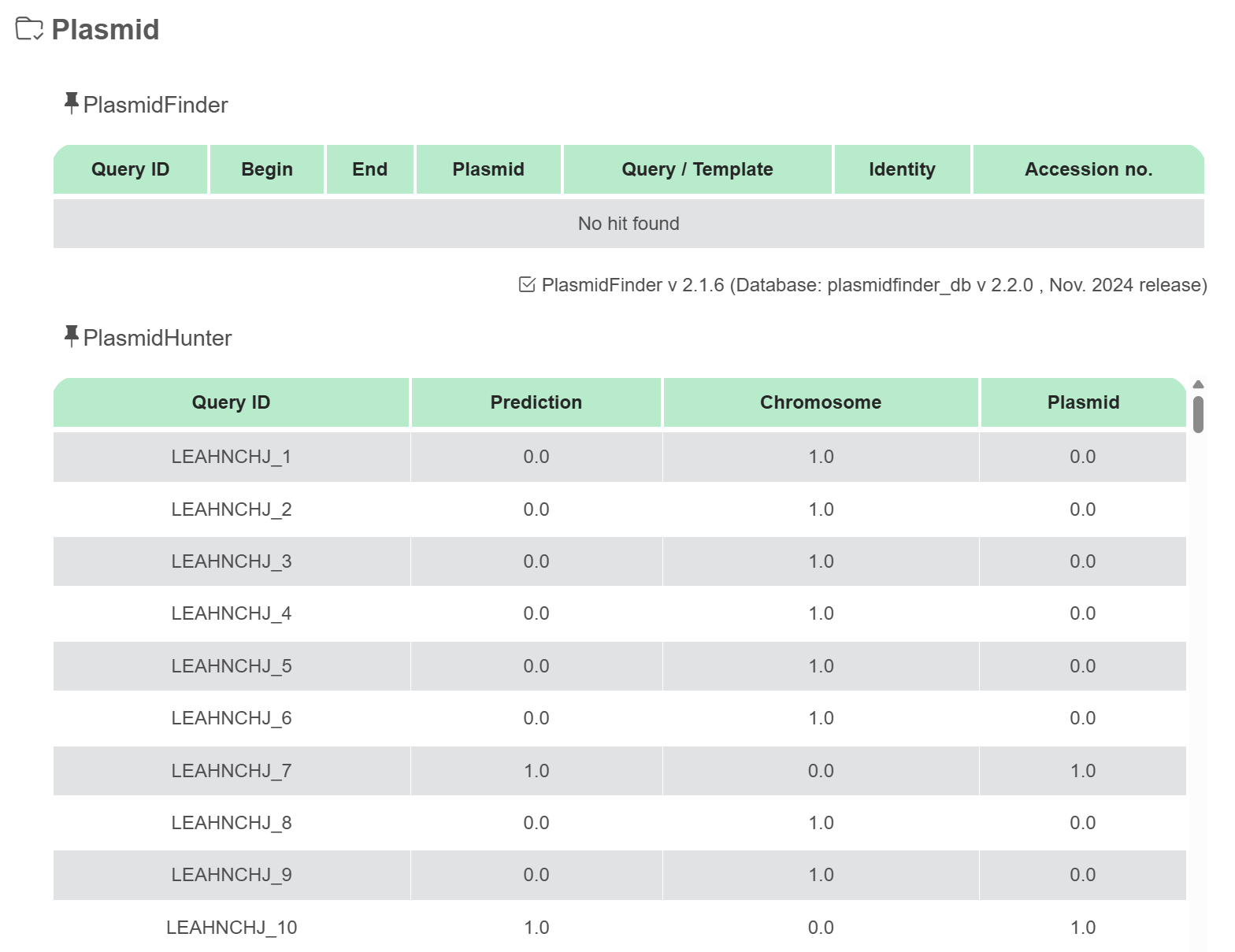 | Plasmid genes | PlasmidFinder v2.1.6 | plasmidfinder_db v2.2.0 (Nov. 2024 release) |
