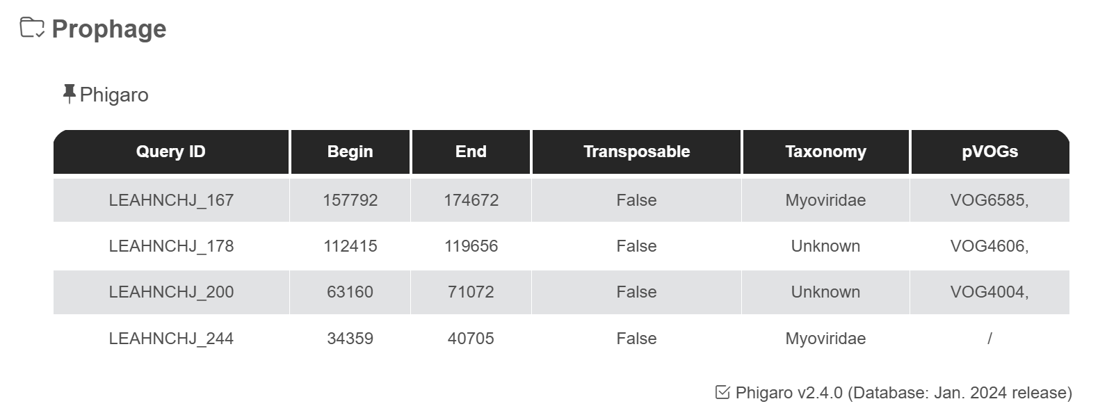 | Prophage regions | Phigaro v2.4.0 | (Jan. 2024 release) |